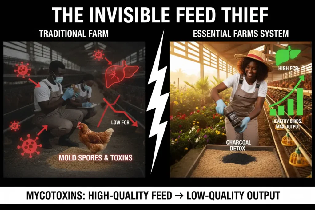 This is why farms that “buy good feed” still experience unexplained losses. The problem is not formulation—it is contamination.