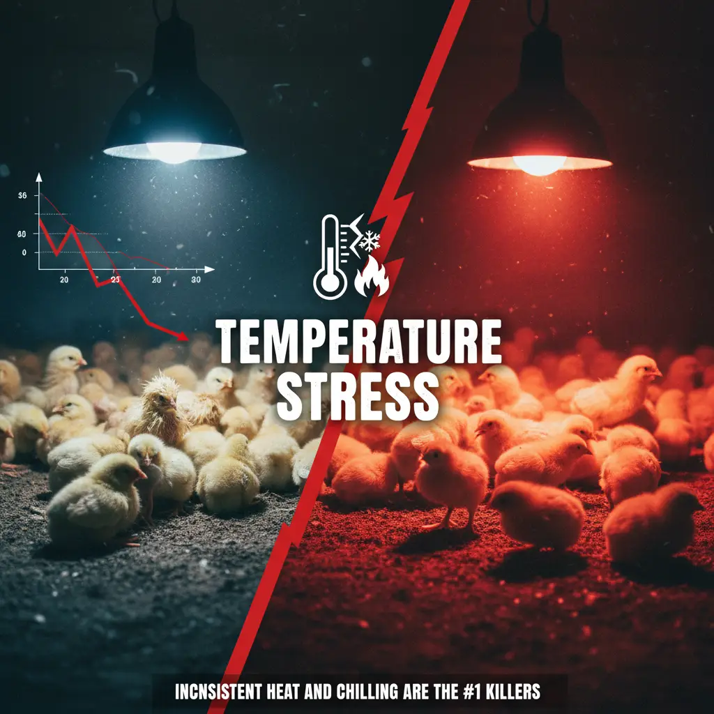 Chicks cannot regulate their body temperature. Even small fluctuations cause chilling, piling, dehydration, and death. Inconsistent heat also weakens immunity, making birds vulnerable to disease.