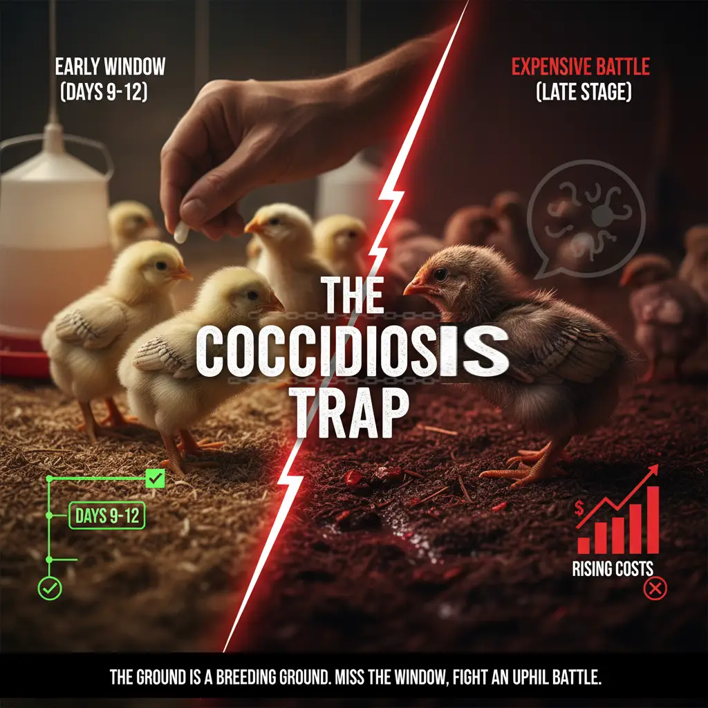 The ground (deep litter) is a breeding ground for coccidiosis. If you miss the early medication window (Days 9-12), you’re fighting an uphill, expensive battle.