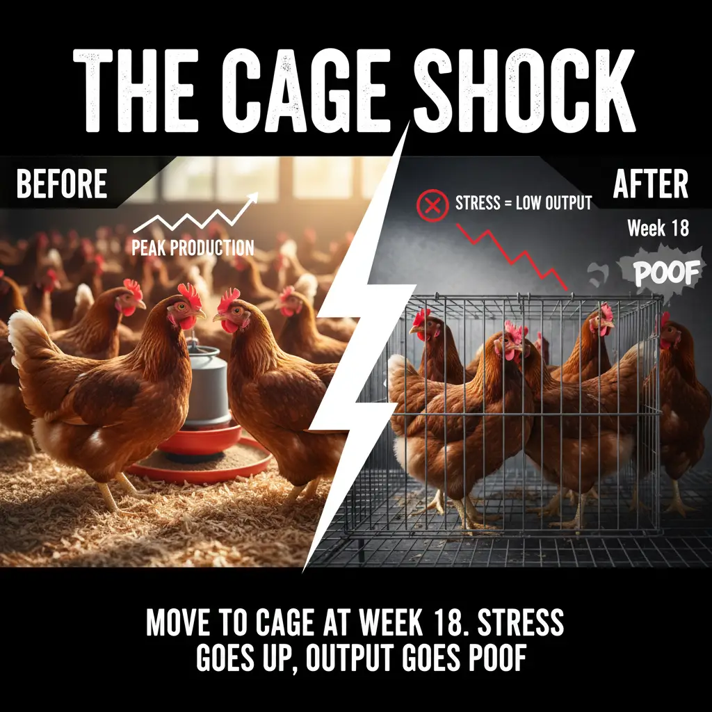You move a bird straight from a wide-open floor into a cramped cage the minute it starts laying (Week 18). The stress level goes through the roof, and the bird just goes poof—it misses peak production. Stress equals low output.